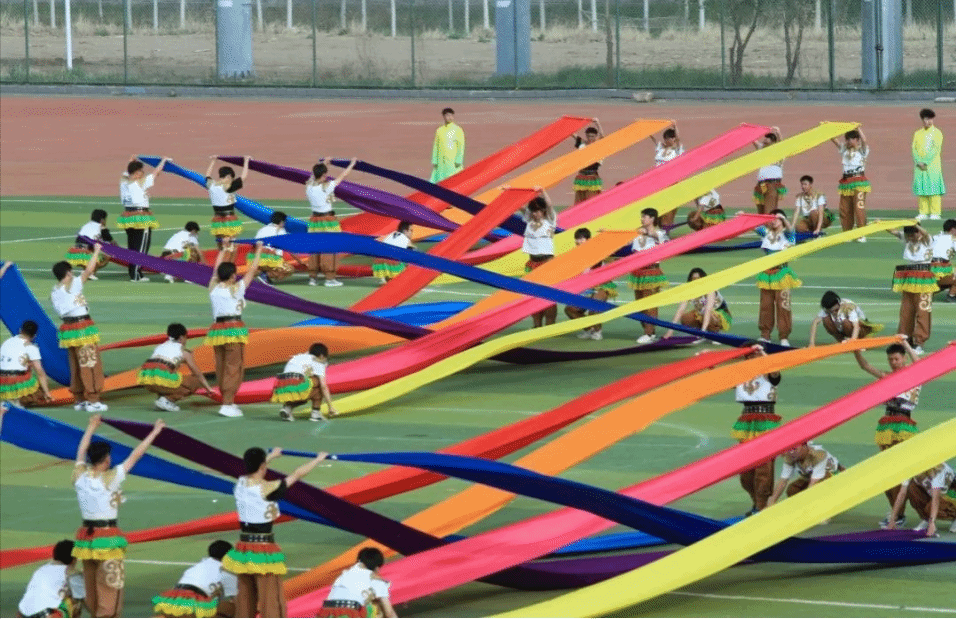 运动会开幕式上,丝绸表演惊艳全场。五彩丝绸如灵动彩练,舞者舒展身姿,或擎绸旋转,绸缎翻飞间似云霞漫卷;或挥绸俯冲,流光溢彩如浪涛奔涌。丝绸与光影交织,在舞台上勾勒出山河壮丽之景,尽显东方美学韵味,赢得阵阵掌声。