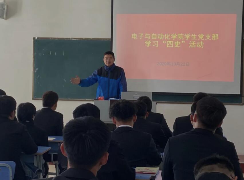 为进一步学习贯彻习近平总书记关于学习党史、新中国史、改革开放史、社会主义发展史的重要指示精神,2020年10月22日,电子与自动化学院学生党支部组织学生党员开展学习“四史”活动,本次学习在B214举行,学生党员及教师党员参加本次学习,党支部书记石磊主持本次学习活动。