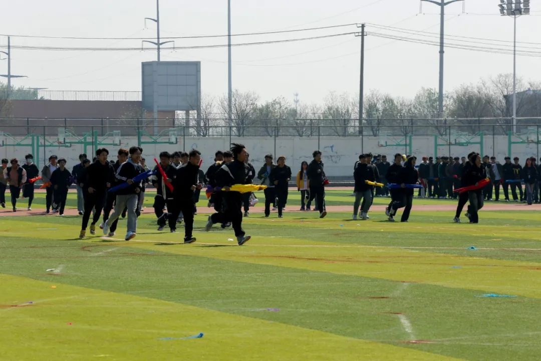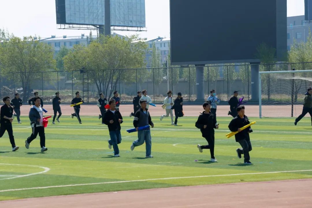 奔跑的少年们,仿若脱缰的骏马,在红色的跑道上肆意驰骋。他们的发丝被风扬起,额间的汗珠闪烁着晶莹的光,急促的呼吸声与有力的心跳声交织在一起,谱写成一曲动人的奋进之歌。他们手中紧握的道具,随着奔跑的节奏有韵律地摆动,似是在为自己加油鼓劲,又似在向世界宣告他们的壮志豪情。