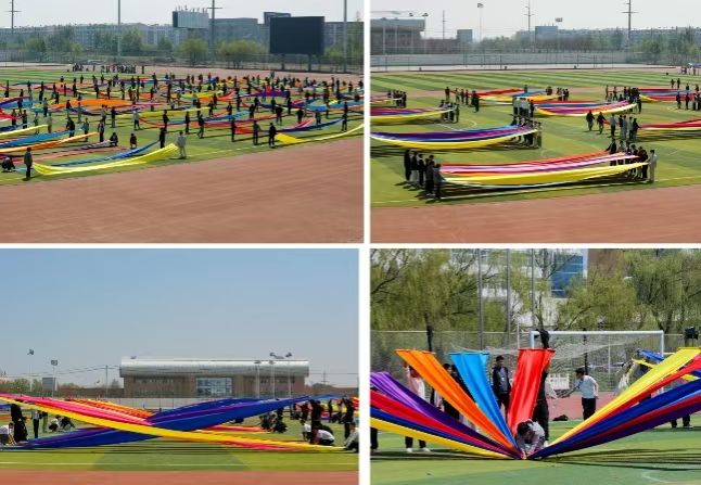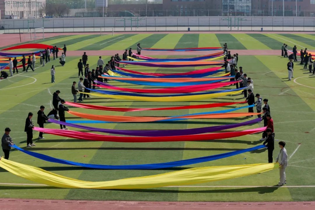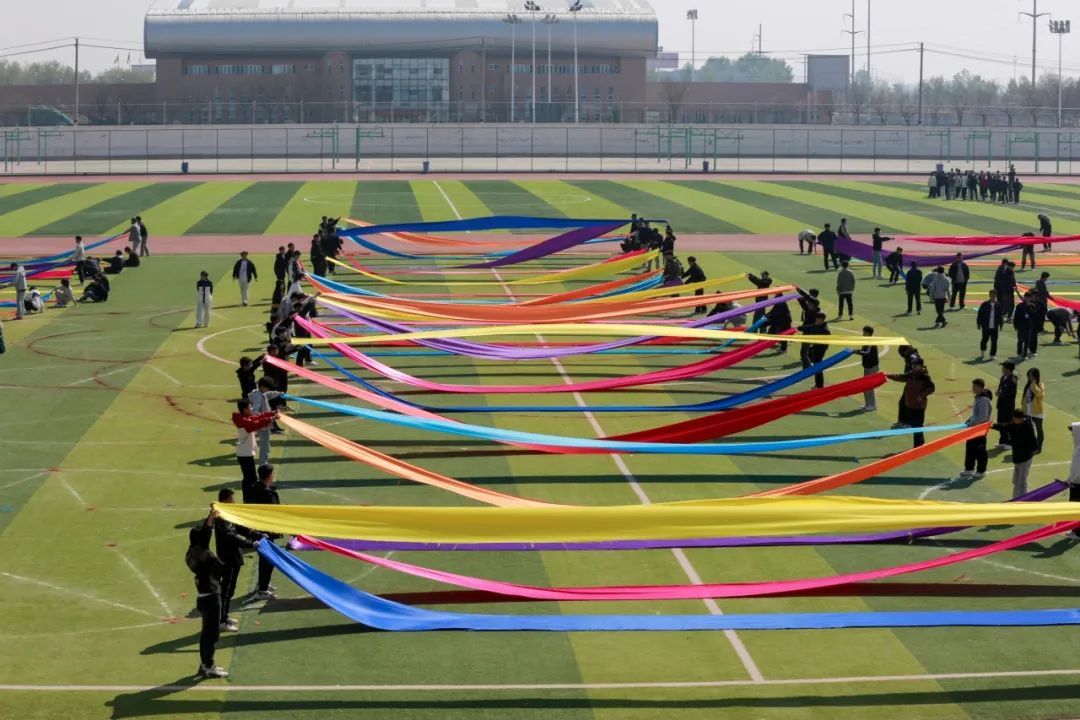 一条条五彩斑斓的绸带,宛如从梦幻仙境中飘落的虹霓,在同学们有力的手中肆意舒展、轻盈飘扬。它们时而如灵动的游龙穿梭嬉戏,时而似飘逸的云朵随风舞动,每一次的起伏与飞扬,都似在诉说着对即将到来运动会的热切憧憬。
