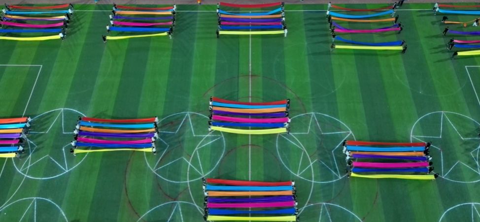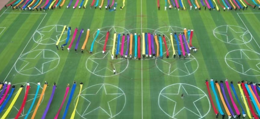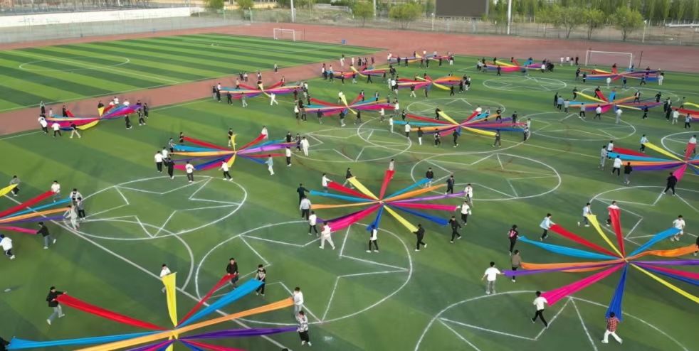 每一次造型的变化都经过精心编排,充分展现了创意与团队协作精神。尤其是在场地中央,众多彩带汇聚成一个巨大的星形图案,寓意着运动会将如星辰般闪耀。