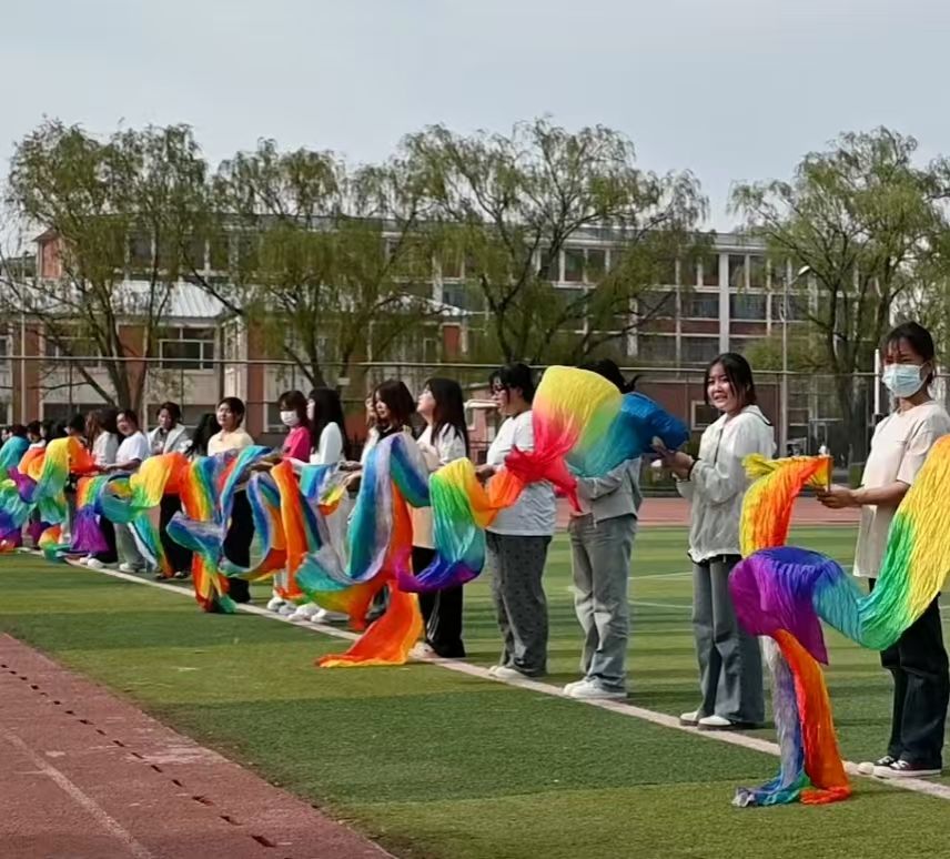 彩排现场,学生们不断变换着造型。彩带如花瓣般舒展,时而组成绽放的花朵,;时而排列成整齐的方阵,彩带似飘扬的旗帜。