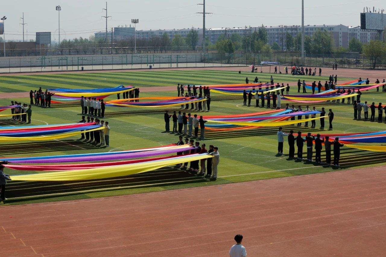 在宽阔的绿茵场上,上千名学生持五彩斑斓的彩带整齐列队,从高空俯瞰,他们宛如镶嵌在绿色绒布上的多彩宝石。随着音乐响起,学生们舞动彩带,红、橙、黄、绿、蓝、靛、紫交织在一起,似一道道绚丽的彩虹在场上飘动,为运动会开幕式提前渲染出热烈欢快的氛围。
