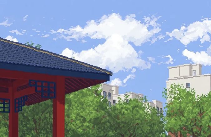 现实中,蓝天下的凉亭静立,承载着课间的闲谈与午后的静谧。当化作次元像素,红柱黑瓦在蓝天绿树间更显明快,仿佛从动漫场景中截取的片段,同样的风景,在不同次元诉说着相同的悠然。