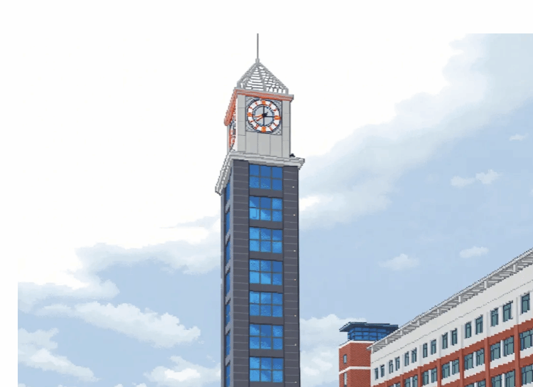 现实里,钟楼静静伫立,用指针丈量着校园的朝朝暮暮,见证无数上课铃响与下课喧嚣。次元像素重构后,蓝灰的塔身、明亮的窗,像是从怀旧游戏画面中走出,不同次元里,它始终是时光的守望者,滴答声里藏着不变的校园记忆 。