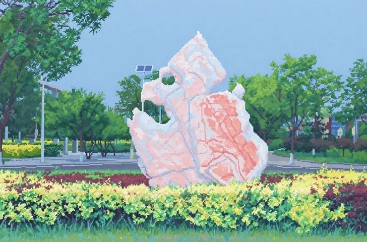 现实中,景观石在花草簇拥里,以天然姿态成为校园一景,藏着自然的野趣与宁静。次元化后,像素拼接出的石形、色彩,让它像是游戏里的奇幻布景,虽形态变了,那份点缀校园、给人带来视觉与心灵触动的意韵,在两个次元从未改变 。