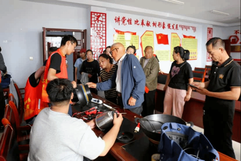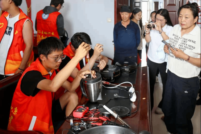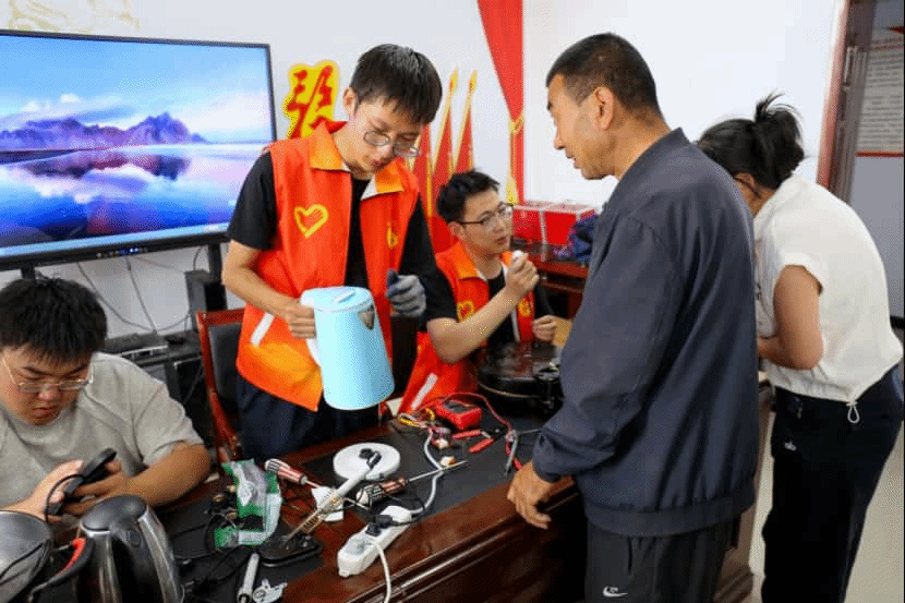 随后,家电维修服务火热开展。居民们带着故障的鼓风机、热水壶、电炒锅等家电前来求助。同学们运用专业知识,迅速排查故障、更换零件,让一件件 “罢工” 的电器恢复运转,解决了居民们的生活难题,收获众多感谢与称赞。