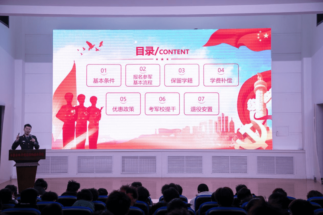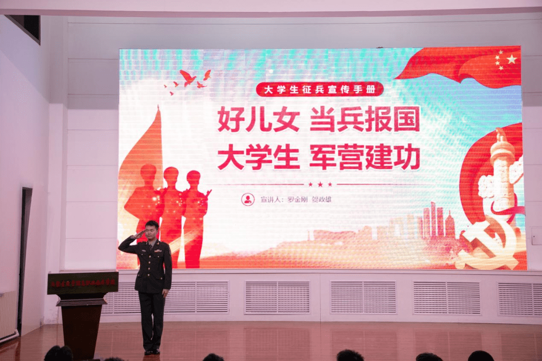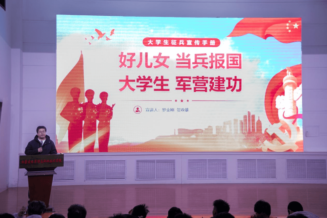 讲座中,学生科科长罗金刚围绕国家征兵政策进行了详细解读,重点介绍了报名条件、入伍流程、体检标准以及学费补偿代偿、专升本免试、经济补助等优惠政策,帮助学生全面了解参军入伍的各方面保障