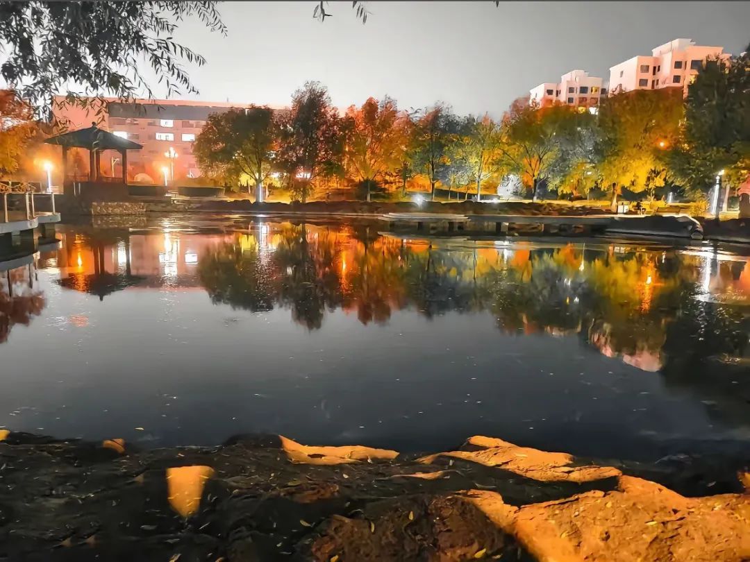 湖面如镜,倒映岸边树木、落叶散落在岸边石上,亭子静立一侧,光影在水面摇晃,任晚风轻拂,每一眼都是校园生活里宁静美好的实景片段。