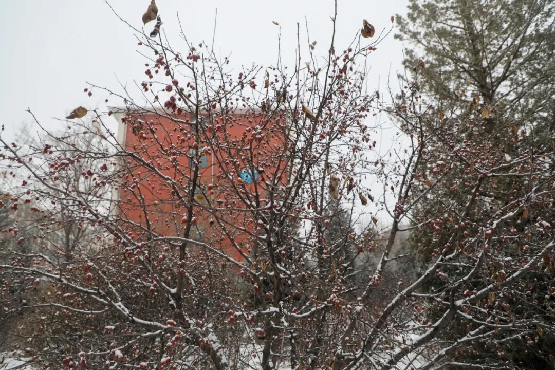 图书馆的红墙金字在雪雾中若隐若现,雪粒落在枝桠间,将馆名衬得愈发庄重;一旁的教学楼红白相间,硬朗的建筑线条在白雪的柔化下多了几分暖意,红阶白栏覆着薄雪,仿佛在等待学子们踏雪而来。图书馆的墨香与教学楼的书声,在初雪的笼罩下,汇成了校园里最动人的旋律。