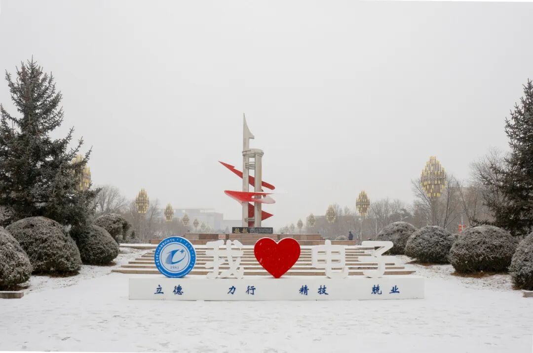 “我爱电子”的字样在白雪里格外醒目,红心跳动的色彩与覆雪的白色字雕相映,下方“立德、力行、精技、兢业”的校训静静铺展。校徽的蓝白在雪色中更显澄澈,背后的雕塑红银相间,雪花落在雕塑的棱角与校训碑的纹路里,像是为校园的初心,烙上了一枚纯净的雪印。