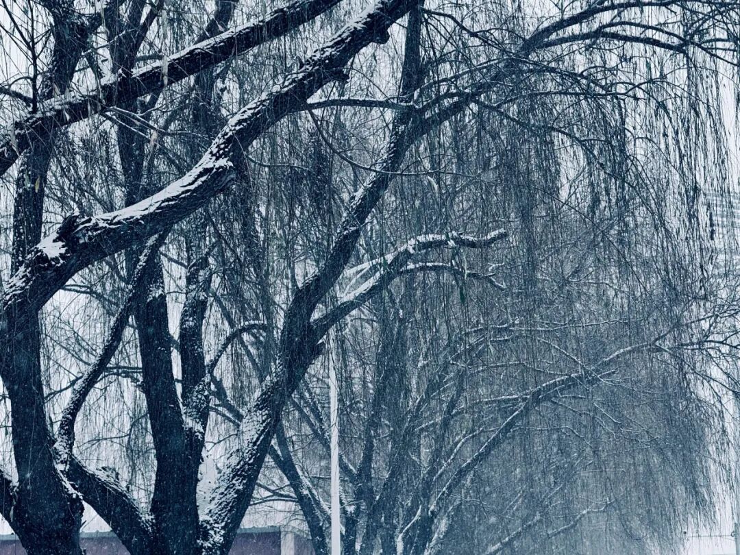 枝间雪舞 生机暗藏雪粒缀在枝叶间,绿与白交织出清新的层次;红果挂在秃枝上,艳红与冷白碰撞出鲜活的色彩;垂柳的枝条裹着薄雪,墨色枝桠在白茫中勾勒出写意的线条。看似萧瑟的枝头,却因初雪的点缀藏着别样的生机,像是在告诉我们,冬日的蛰伏,是为了来年更热烈的绽放。