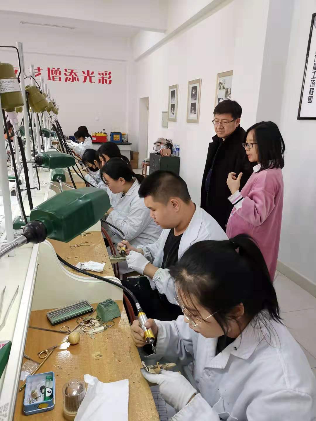 座谈会后,校长助理郗文德陪同我校三位老师参观了工程学校的实习实训楼。一行人实地参观考察了图形设计实训工作室、装饰施工实训工作室、首饰加工工作室、珠宝鉴定实训室、玉石加工实训室、珠宝与玉石施工与市场营销实训室、无人机实操实训室、无人机室外实训场地和测量实习室等实验实训室,对内蒙古工程学校的优势专业和实验实训室建设情况有了详细的了解。