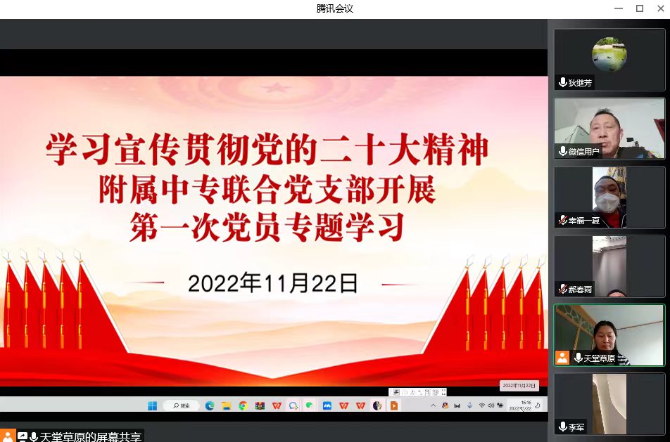 11月22日,附属中专联合党支部全体党员围绕党的二十大通过的《中国共产党章程(修正案)》开展云端专题学习会。全体党员参加会议,支部组织委员包达林台领学。