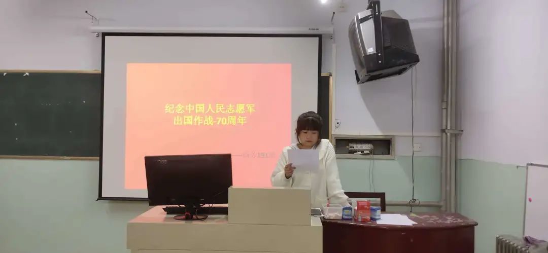 团日活动上各团支部自行组织观看了关于抗美援朝的相关视频,并学习了习近平总书记《在纪念中国人民志愿军抗美援朝出国作战70周年大会上的讲话》,通过了解人民志愿军的英雄事迹,使同学们深刻领悟到抗美援朝精神的实质,同学们纷纷表示要奋发图强,积极上进,争做新时代好青年。