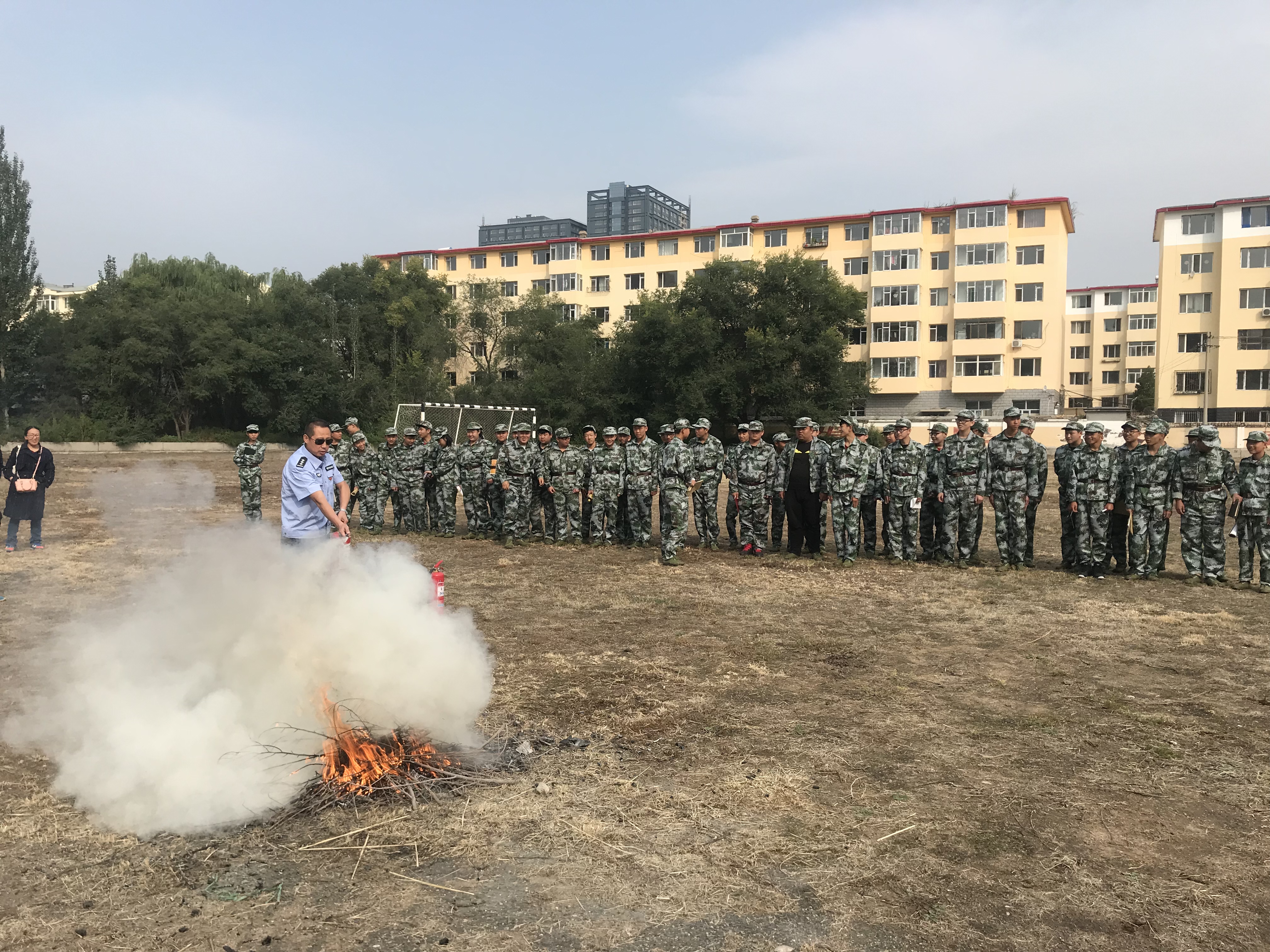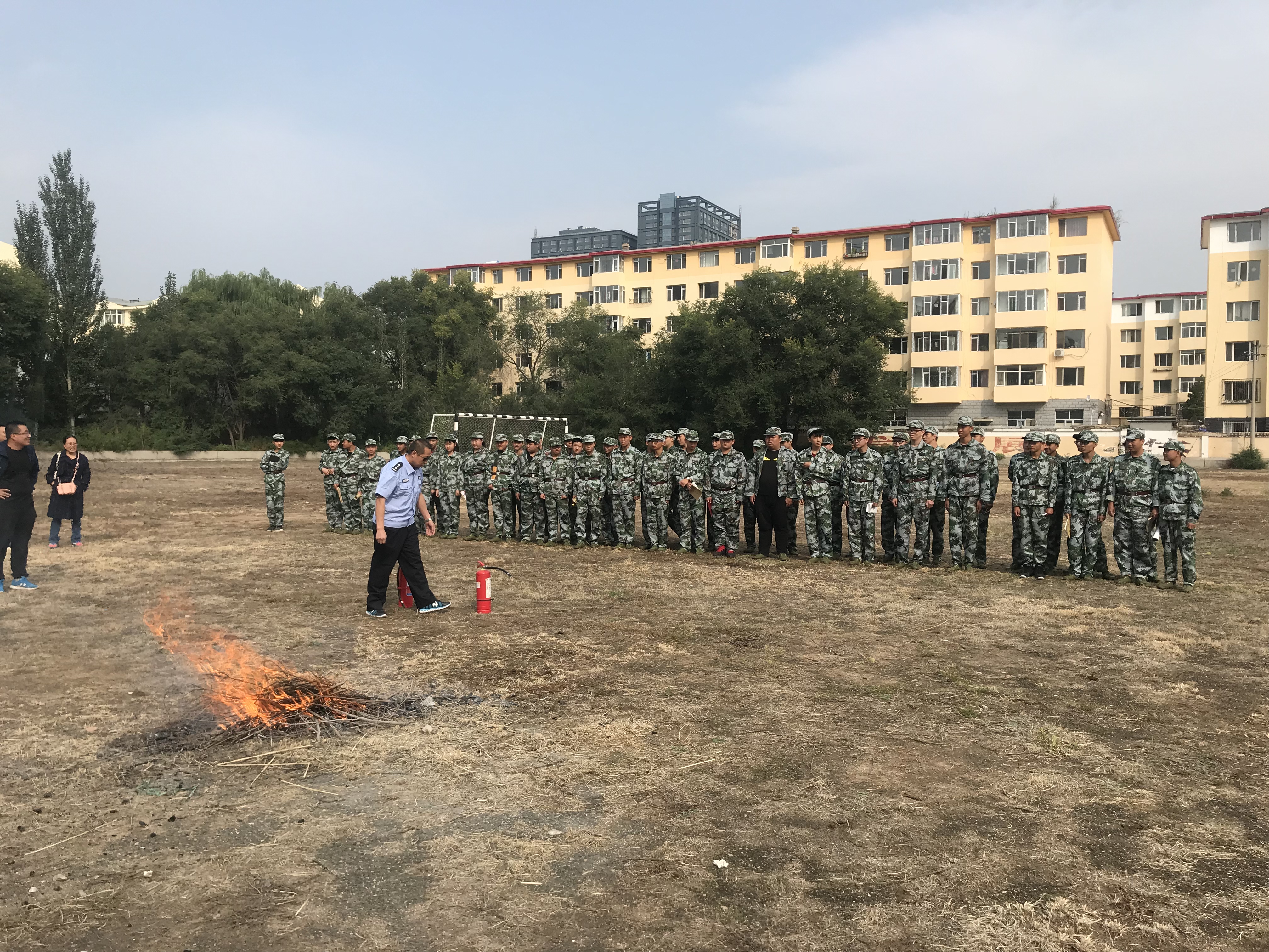 随后,师生们来到学校运动场,进行了使用灭火器灭火的实操演练。
