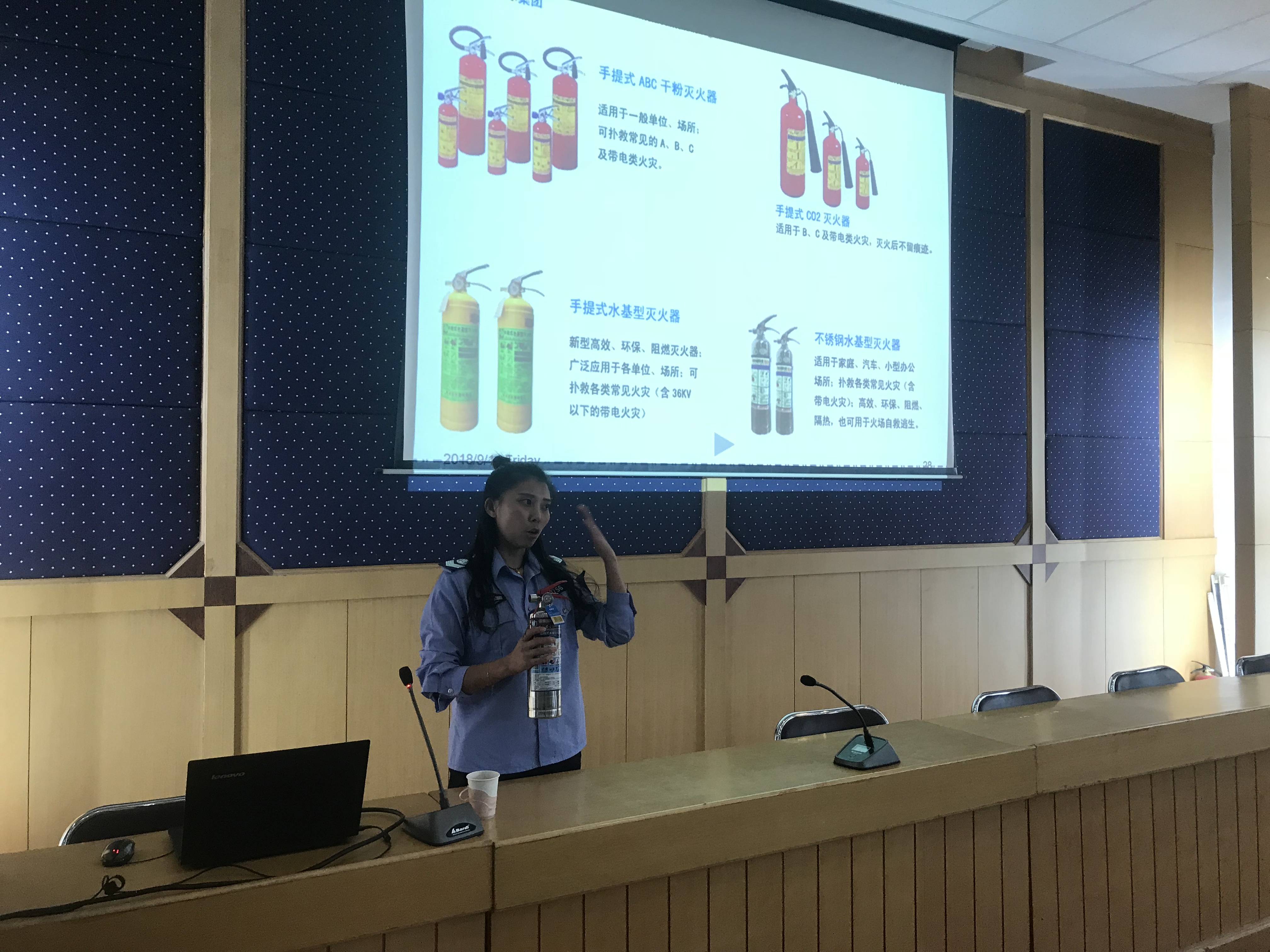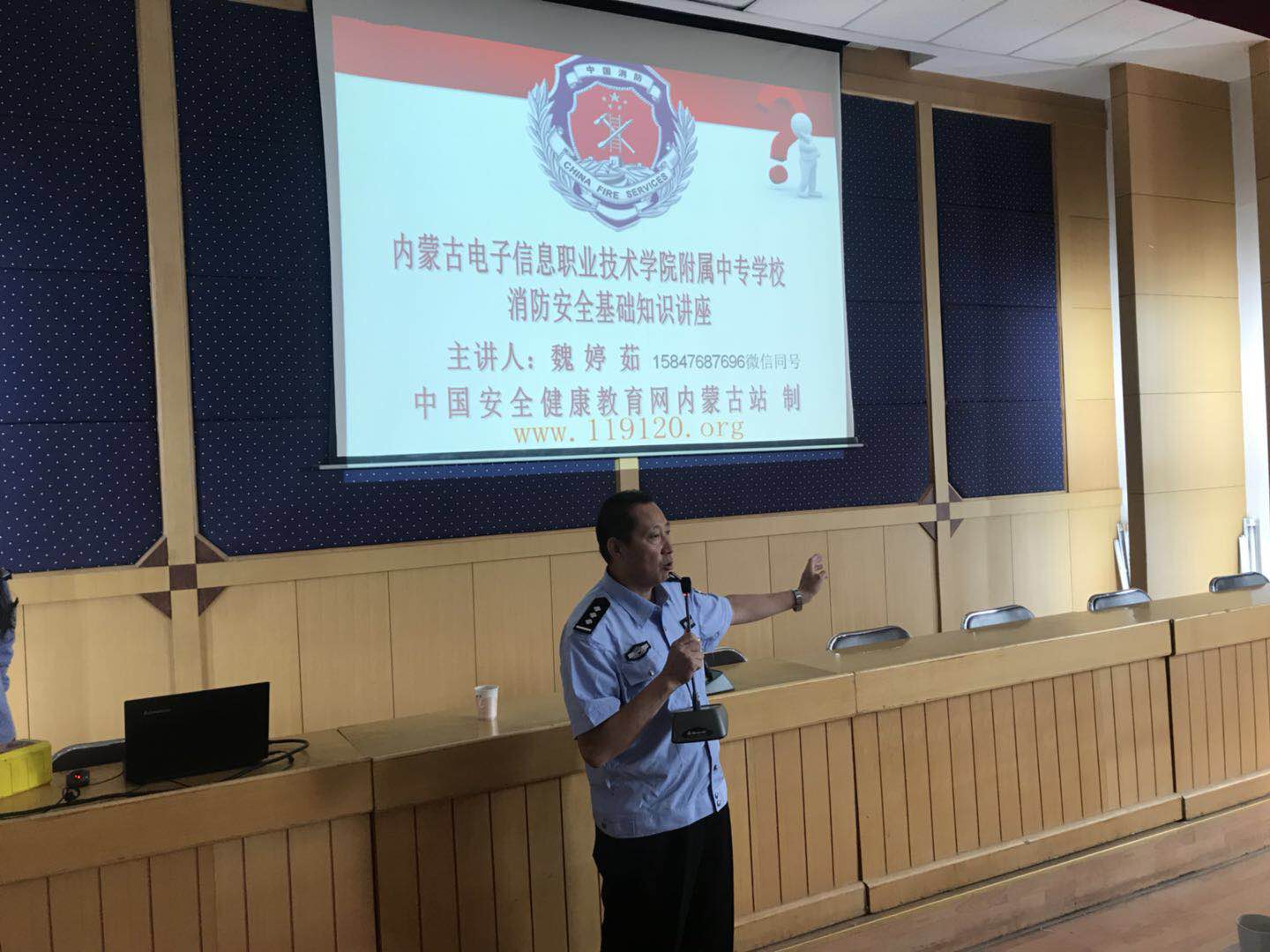 在安全教育讲座中,来自中国安全健康教育网内蒙古站的魏婷茹教官向师生们介绍了近年来全国范围内发生的火灾真实案例;示范了使用专业灭火器材的正确方法;介绍了常见的消防逃生设施和逃生途径;讲解了公共场所中灭火器、防毒防烟面具等消防逃生设施的存放位置。魏婷茹教官在讲座中重点强调,全体师生一定要增强安全意识,极力消除校园内的火灾隐患,防止安全事故发生。