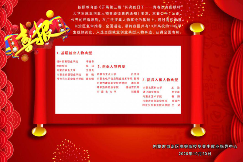 我校2019届市场营销专业毕业生郭帅同学在教育部《第三届“闪亮的日子-青年该有的模样”大学生就业创业人物事迹征集活动》中,最终入选全国大学生“创业典型人物”,获得全国表彰。