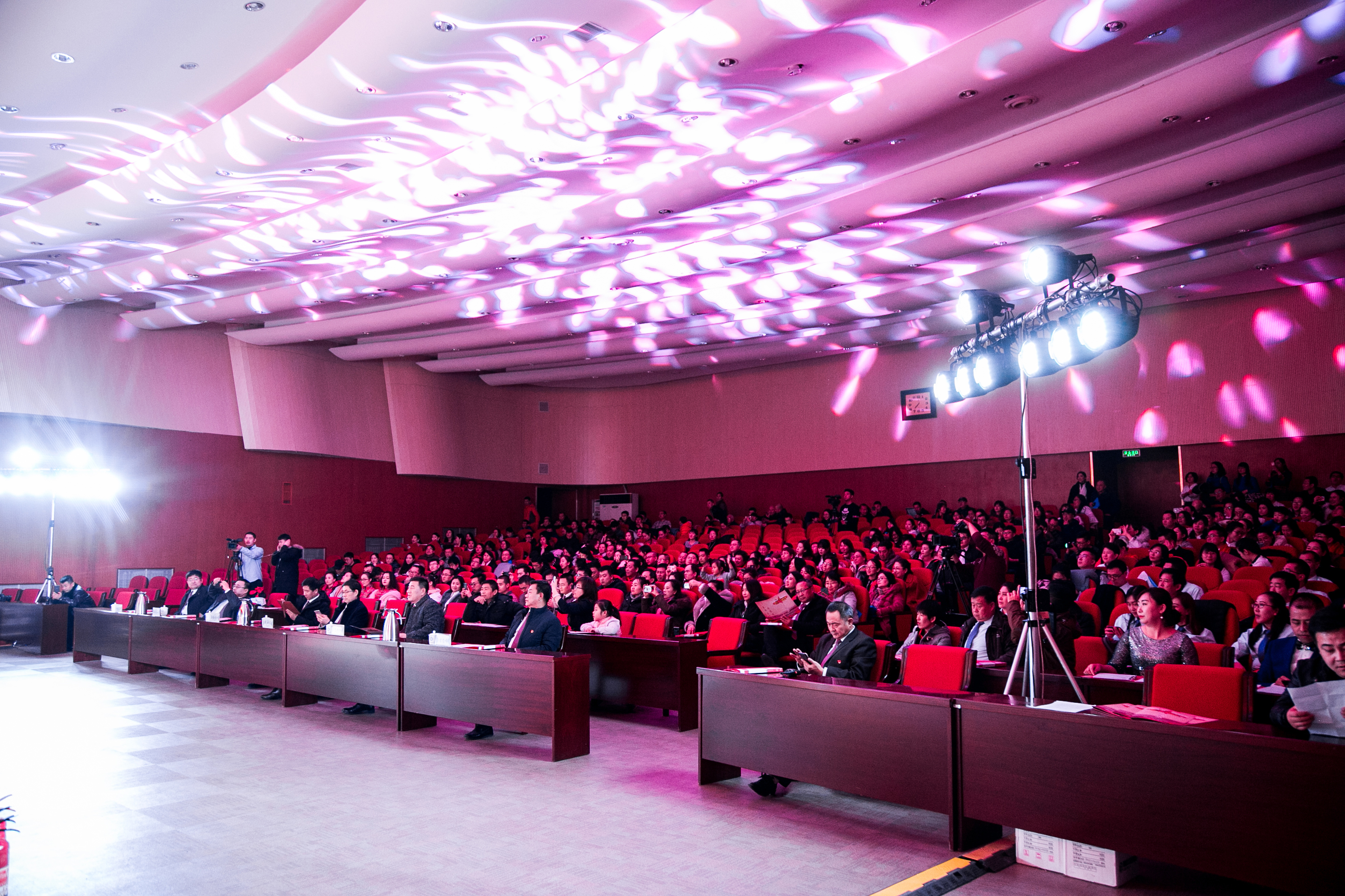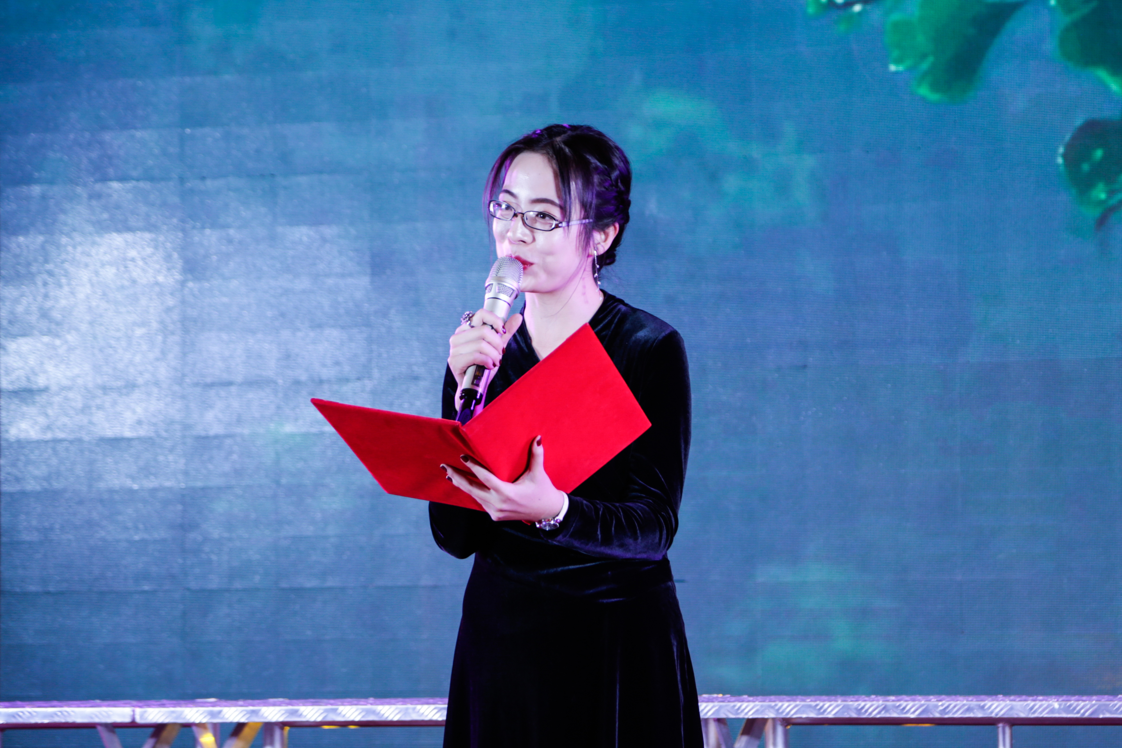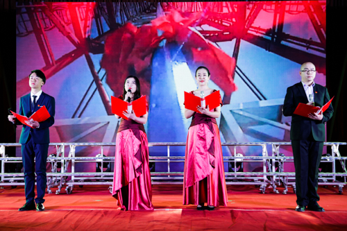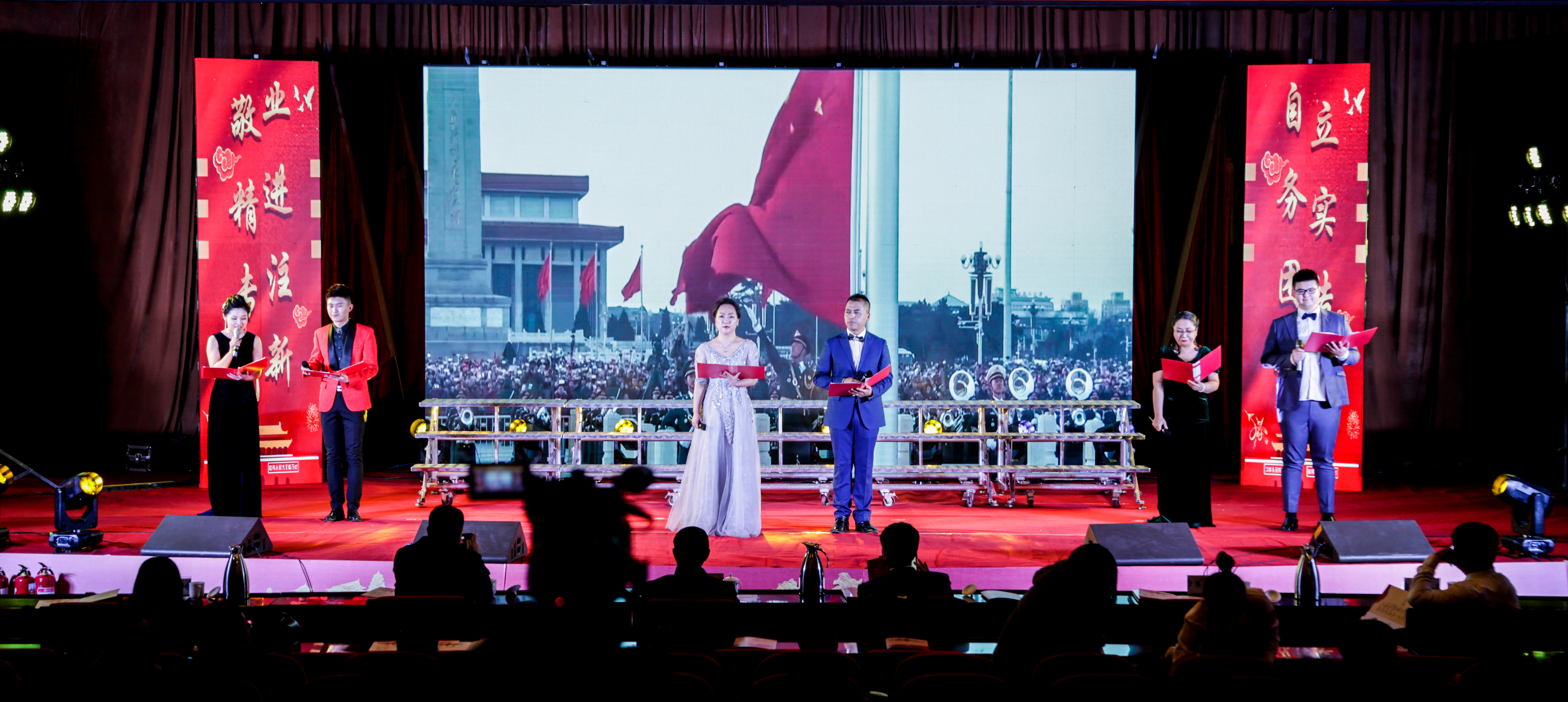 装扮一新的会议中心一号报告厅内灯光璀璨,舞台上方的横屏上,蒙汉双语书写的“内蒙古电子信息职业技术学院合唱诵读晚会”在华灯照耀下光彩夺目。中央主屏幕上,“弘扬爱国奋斗精神、建功立业新时代”和“庆祝改革开放四十周年”的字样簇拥着金黄色的党徽,在红色五角星的映衬下熠熠生辉。主屏幕两侧的副屏幕上,“敬业、精进、专注、创新”的工匠精神和“自立、务实、团结、拼搏”的学院精神彰显全院师生员工爱国奋斗、建功立业的坚定信念与决心。