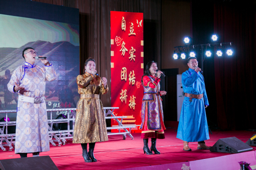 “飞跃八千里路云和月乘风而来,近看草原大地青春焕发的光彩,跨上我心爱的黑骏马踏歌而行,奔向你的怀抱飞扬你的神彩,哈啊咴内蒙古大中华为你齐声喝彩,各族儿女心相连走进壮美的时代……”歌曲《为内蒙古喝彩》带着草原儿女对祖国的殷切祝福拉开了整场晚会的序幕。