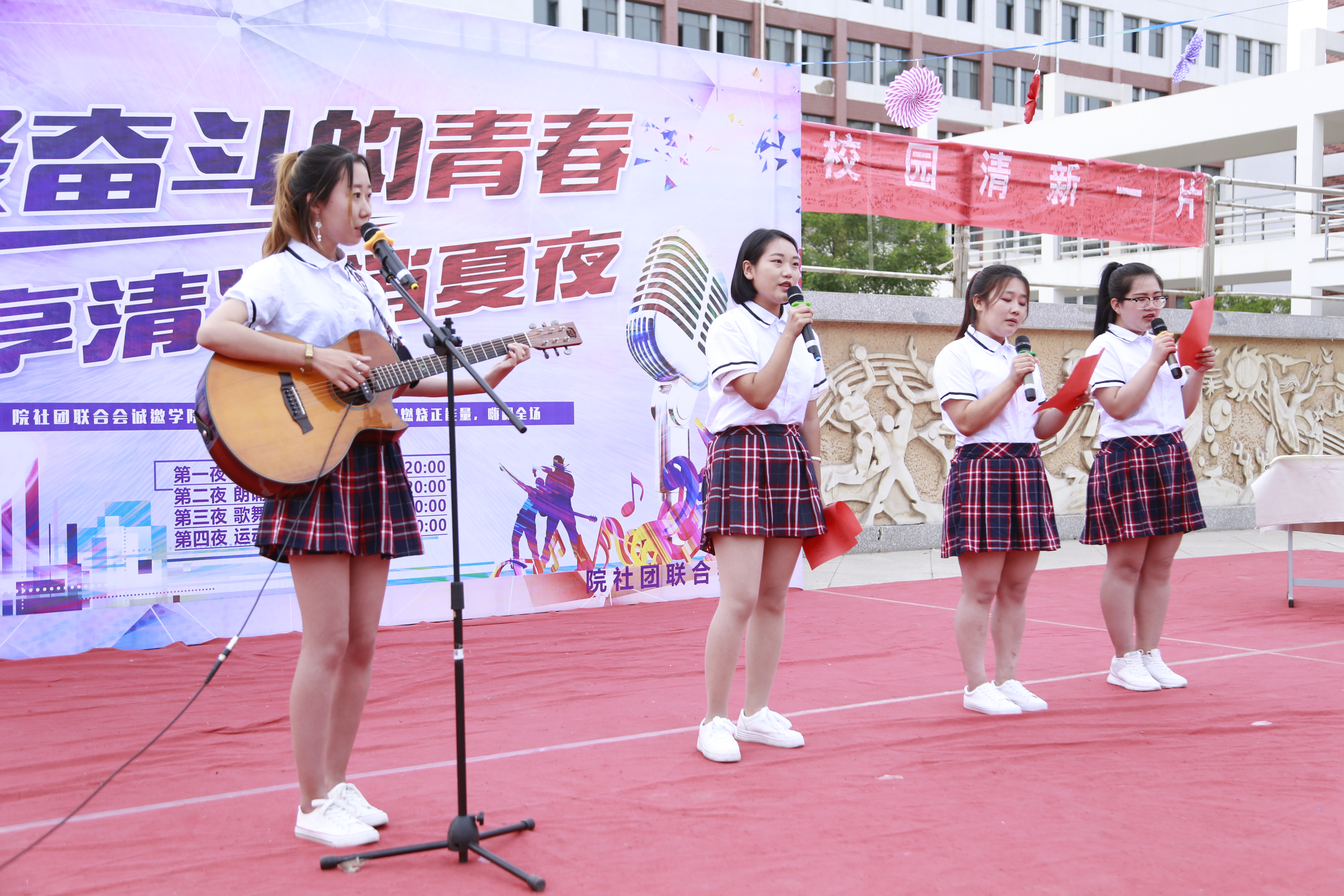 四天的“消夏夜”活动由四场主题夜构成,分别是以学生乐队为主的摇滚之夜;以理论社团、文学社团、朗诵社团为主的朗诵之夜;以舞蹈类社团、音乐类社团为主的歌舞之夜;以运动类社团为主的运动之夜。这些活动,让同学们体验到了轻松、温馨、青春、健康的大学课余生活。因此,前来欣赏社团表演、参与活动互动的同学络绎不绝,并对本次系列活动的成功举办赞不绝口。