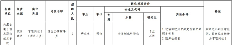 根据《2019年内蒙古电子信息职业技术学院自主公开招聘工作人员简章》,我校将达不到开考比例的 “项目人员”岗位转成普通岗位。即:管理岗位2(项目人员)岗位转成管理岗位1。