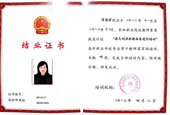 2012年11月,我院教师薛慧君跟随教育部职业院校教师境外培训团赴澳大利亚墨尔本NMIT学院实践学习,为期1个月。