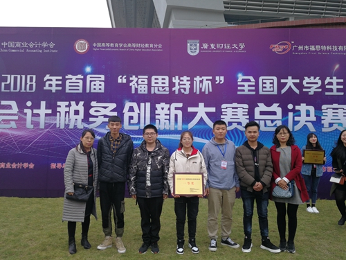 2018年首届“福斯特杯”全国大学生会计税务创新大赛总决赛于12月8日在广东财经大学举办,我院会计专业学生王露露,张旭东,郑宏基,王建,王金柱5名同学组成的代表队荣获高职组一等奖。