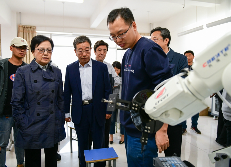 9月20日下午,教育部原副部长、中国职业技术教育协会会长鲁昕在教育厅副厅长张喜荣陪同下就高职园区建设专题来我校调研。党委副书记、校长王生铁,党委副书记、纪委书记张涵义,副校长巴根那,郑志丽陪同视察了我校云计算、大数据实训基地,计算机网络安全实训基地,无人机、工业机器人实训室。