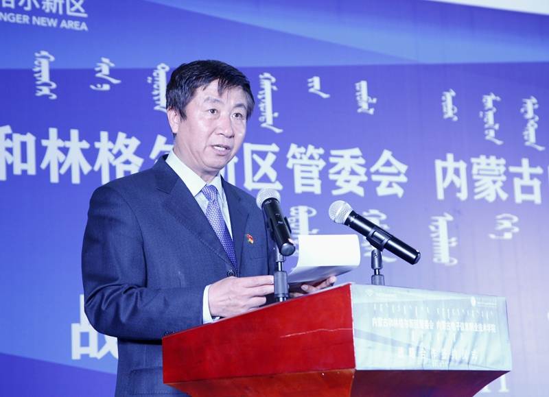 签约仪式上,张鹏宇首先致辞。他表示,当前生产制造领域工业化与信息化深度融合,促进“中国制造”向“中国智能制造”转型。现代信息技术在企业研发、生产、经营、管理等环节的渗透持续深化,电子信息类人才培养发挥着基础性、全局性、关键性作用。内蒙古电子信息职业技术学院作为国家示范性软件职业技术学院、自治区示范性高职院校和自治区优质校,积极响应国家“大众创业、万众创新”号召,抢抓自治区经济产业转型升级机遇,与自治区信息化产业发展形成良性互动,为行业企业提供了大量信息化创新型人才。此次签约合作,是内蒙古电子信息职业技术学院和内蒙古和林格尔新区双方面向未来、共谋发展的一项重要战略举措,也是双方推动“产教融合、校企合作”的重要步伐。双方将以本次战略合作签约为起点,校政企协同共建,加强顶层设计,完善制度体系,建立有效运行机制,共同创建长期稳定、共荣多赢的合作关系;校政企携手共进,互为发展动力基础,互为创新创造支撑,手挽手,肩并肩爬坡过坎,共同开创事业发展新途径、创新创业新空间;校政企三方共享,搭乘新时代发展机遇之快车,把握电子信息产业迅猛发展之良机,共同分享辛勤汗水浇灌的学校发展新进展、新区建设新成就、企业创造新硕果。双方的通力合作必将取得校政企深度融合、共同发展的新成效,必将对自治区经济社会转型发展做出新贡献。