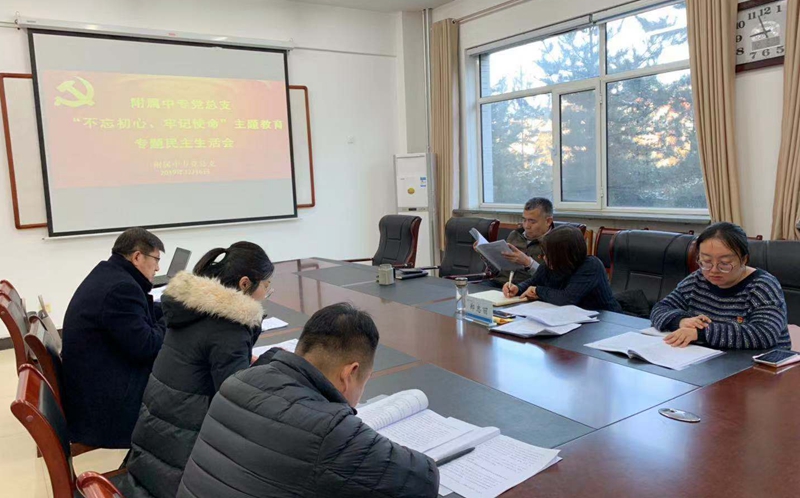 根据学校“不忘初心、牢记使命”主题教育工作安排,12月6日上午, 附属中专党总支“不忘初心、牢记使命”主题教育专题民主生活会在行政楼215会议室召开。学院副院长郑志丽、纪检监察处处长李永才及组织部干部(考核)科科长窦美莎列席指导。附属中专学校领导班子成员雷欣欣、靳洪玲、刘明宇、赵海波参加会议。