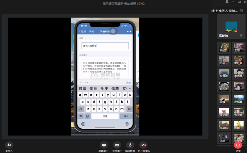 会上,高伊娜强调,“推优入党”工作是共青团极为重要的一项工作,各团支部、团干部要高度重视,在工作过程中也要加强对团员青年的思想引导。她指出,虽然在特殊时期采取线上工作的方式,但仍旧要做到严格有序,保证推优入党工作的公平、公正、公开。她还在线演示投票环节的具体设置与操作流程。