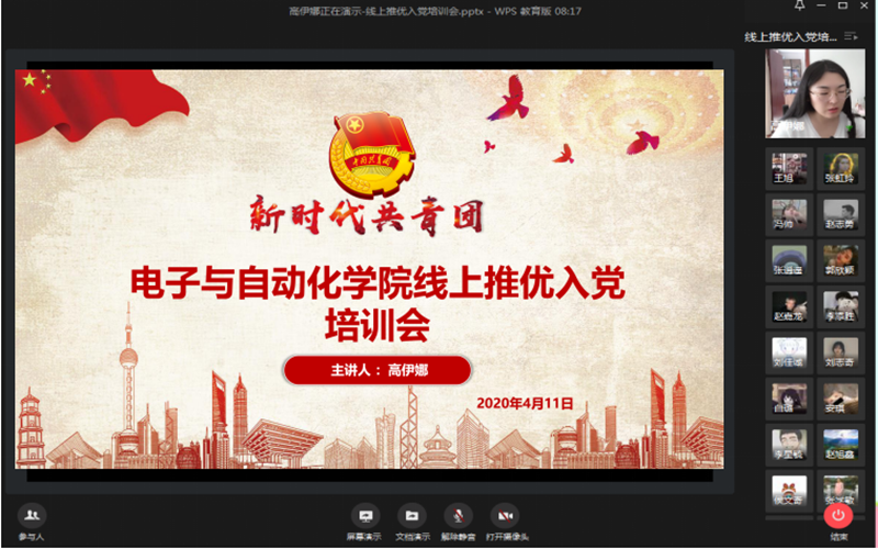 4月11日上午电子与自动化学院团总支书记高伊娜通过“云电院”平台组织召开我院2019—2010年第2学期线上推优入党工作培训会。