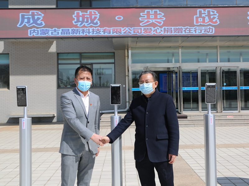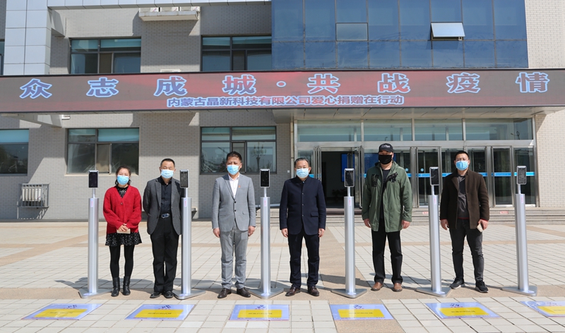 中国联合网络通信有限公司呼和浩特市分公司捐赠医用外科口罩300个,消毒液10件;内蒙古晶新科技有限公司捐赠AI智能测温门禁一体机六套。
