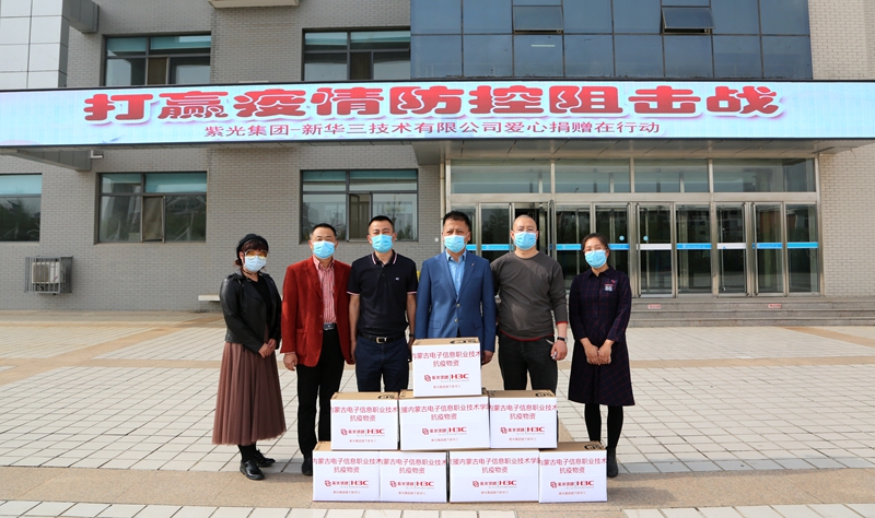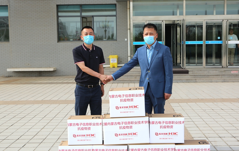 5月7日,内蒙古巨鹏信息科技有限公司和紫光集团旗下新华三技术有限公司两家企业陆续来到学校,为学校捐赠防疫物资,学校党委委员、宣传部部长李占岭代表学校接受捐赠。