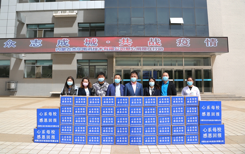 5月12日上午, 学校中专时期96五班无线电专业毕业生段梅带领她的公司成员回到学校捐赠防疫物资。段梅,现为内蒙古杰尔电讯技术有限公司总经理,在得知学校即将复课后,为学校捐赠一次性医用口罩3000个,消毒液50件,消杀喷壶30个。党委委员、宣传部部长兼工会主席李占岭代表学校接受了捐赠。