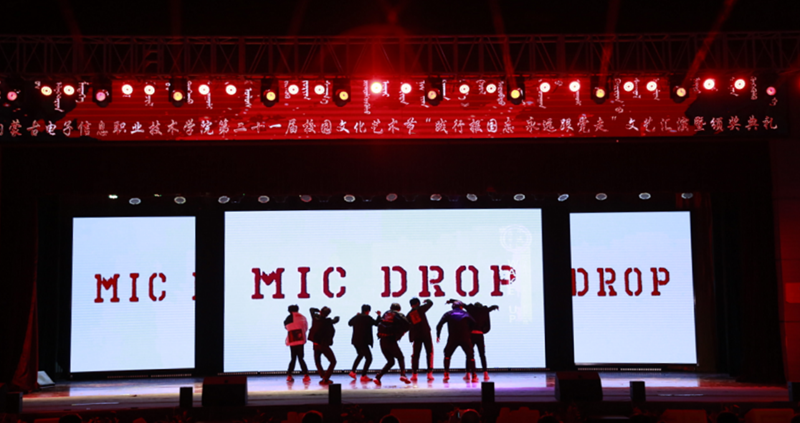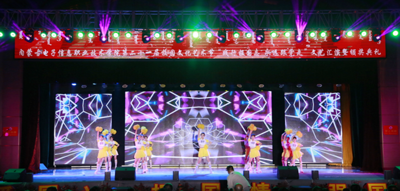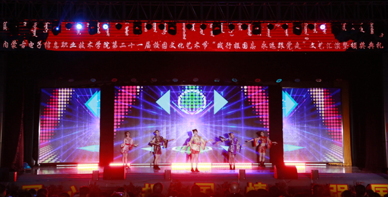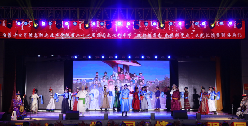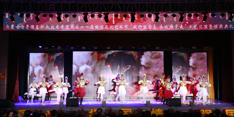 12月7日19:00,内蒙古电子信息职业技术学院“践行报国志 永远跟着党走”第二十一届校园文化艺术节文艺汇演暨颁奖典礼在我校文体馆圆满落幕。自治区党委理论宣教处处长王红凌、自治区教科文卫体工会副主席张国丽、呼和浩特市新城区创新创业服务中心副主任高娃、内蒙古和林格尔新区管委会人事科长陈雷、赛罕区公安分局大学城派出所所长赵建国等各行政执法和消防单位负责人、内蒙古晶新科技有限责任公司董事长张日新、内蒙古TCL光电科技有限公司务副总经理雷磊等职教集团企业代表,我校党委书记李向东、校党委副书记、校长王生铁等党委领导班子一并出席活动,赛罕区公安分局大学城派出所部分民警、消防中队的官兵们同学校各部门、各二级学院和附属中专师生观看了精彩纷呈、美妙绝伦的演出。