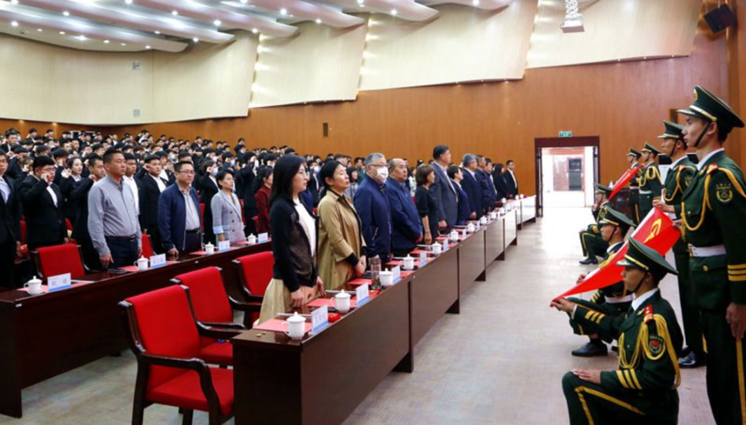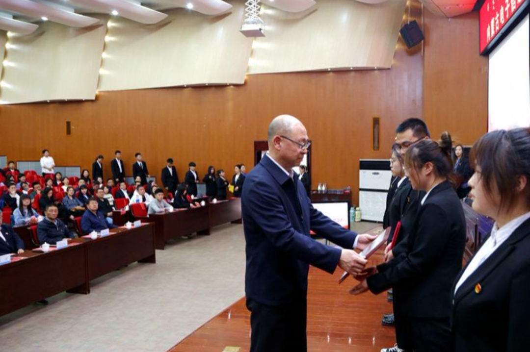 颁奖仪式结束后,开启新团员入团仪式。2021年5月,我校以优中选优的原则按照团员发展实施细则,成功发展了110名共青团员。仪式中,校团委学生副书记田吉一龙同学上台带领全体团员青年重温入团誓词,校领导为新团员代表佩戴团徽。新发展的团员们通过满满的仪式感教育将入团誓词牢记在心,并以此激励自己作为一名共青团员的荣誉感和责任感。