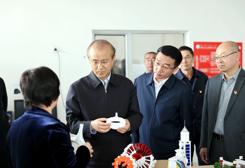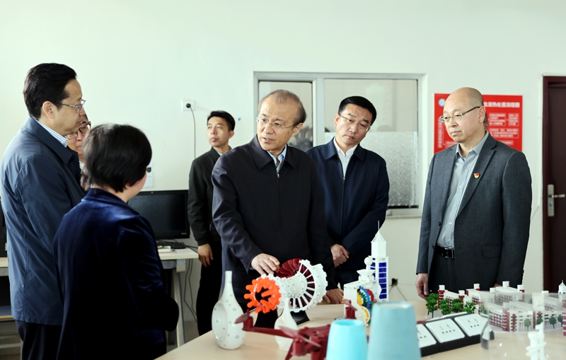 在参观快速成型及逆向工程实训室时,详细询问了3D打印技术的专业性问题,以及专业应用、学生技能实践、学生培养、办学条件、招生与就业等情况。
