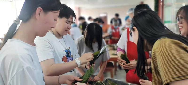 6月10日下午,后勤党总支第一党支部党员们邀请学生志愿者齐聚食堂,分享端午节习俗,学校食堂工作人员向同学们传授包粽子的方法和技巧。一些从未知晓的年代趣事儿让同学们听得津津有味,想象着在那个物资匮乏的年代里端午带来的特殊含义,大家纷纷表示眼前的美好生活来之不易,要饮水思源、格外珍惜。虽然大多数同学都不会包粽子,但是在老师手把手的指导下,同学们用一张张粽叶捆扎成了一个个饱含祝福的的粽子。在快乐的氛围中,大家分享着劳动成果,感受节日的气息。粽子包好后由食堂工作人员帮忙煮熟,同餐饮中心准备的6500只粽子一起免费分发给师生们。