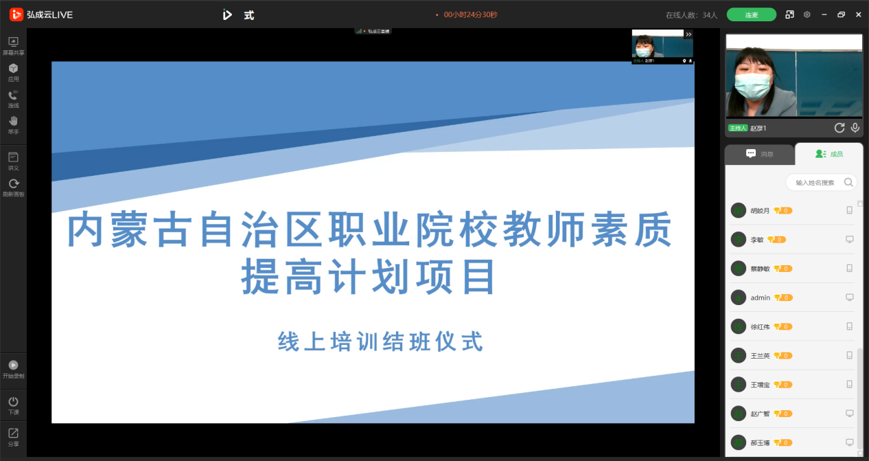 6月2日下午,为期半个月的内蒙古自治区职业院校教师素质提高计划“高职计算机应用技术专业—双师型教师专业技能培训”、“高职信息技术大类—双师型教师专业技能培训”项目班线上培训部分成功举办结班仪式。软件与大数据学院副院长白文荣教授,培训项目全体工作人员,学员60人参加了结班仪式。结班仪式由培训班班主任赵彦主持。