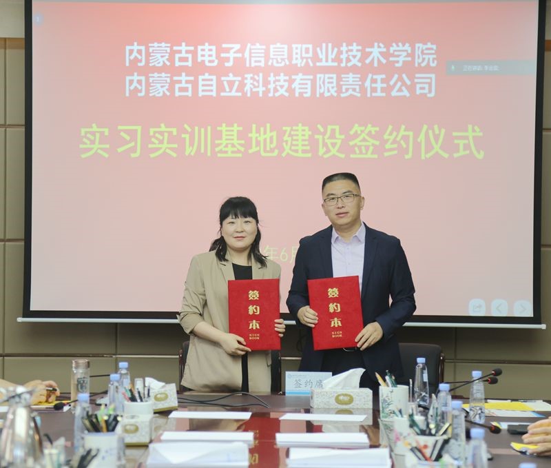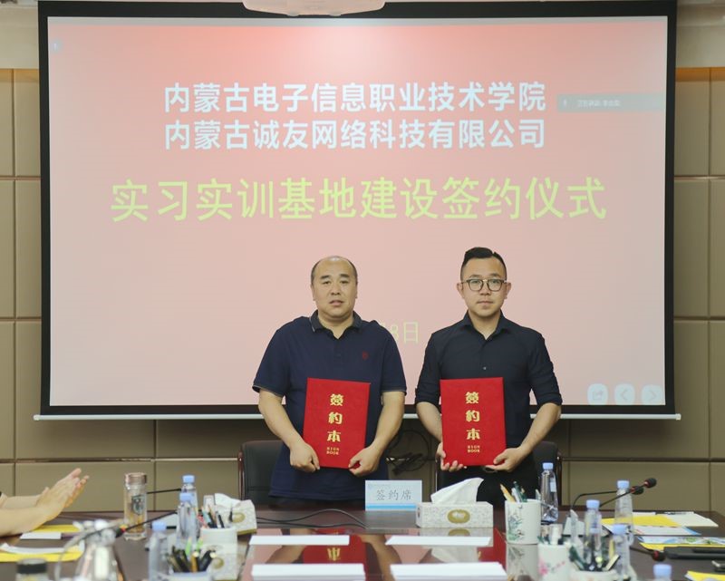 接着计算机与网络安全学院院长郝俊寿与内蒙古诚友网络科技有限公司陈超经理签订实习实训基地建设合作协议。软件与大数据学院副院长白文荣与内蒙古自立科技有限责任公司陈晔总经理签订实习实训基地建设合作协议。