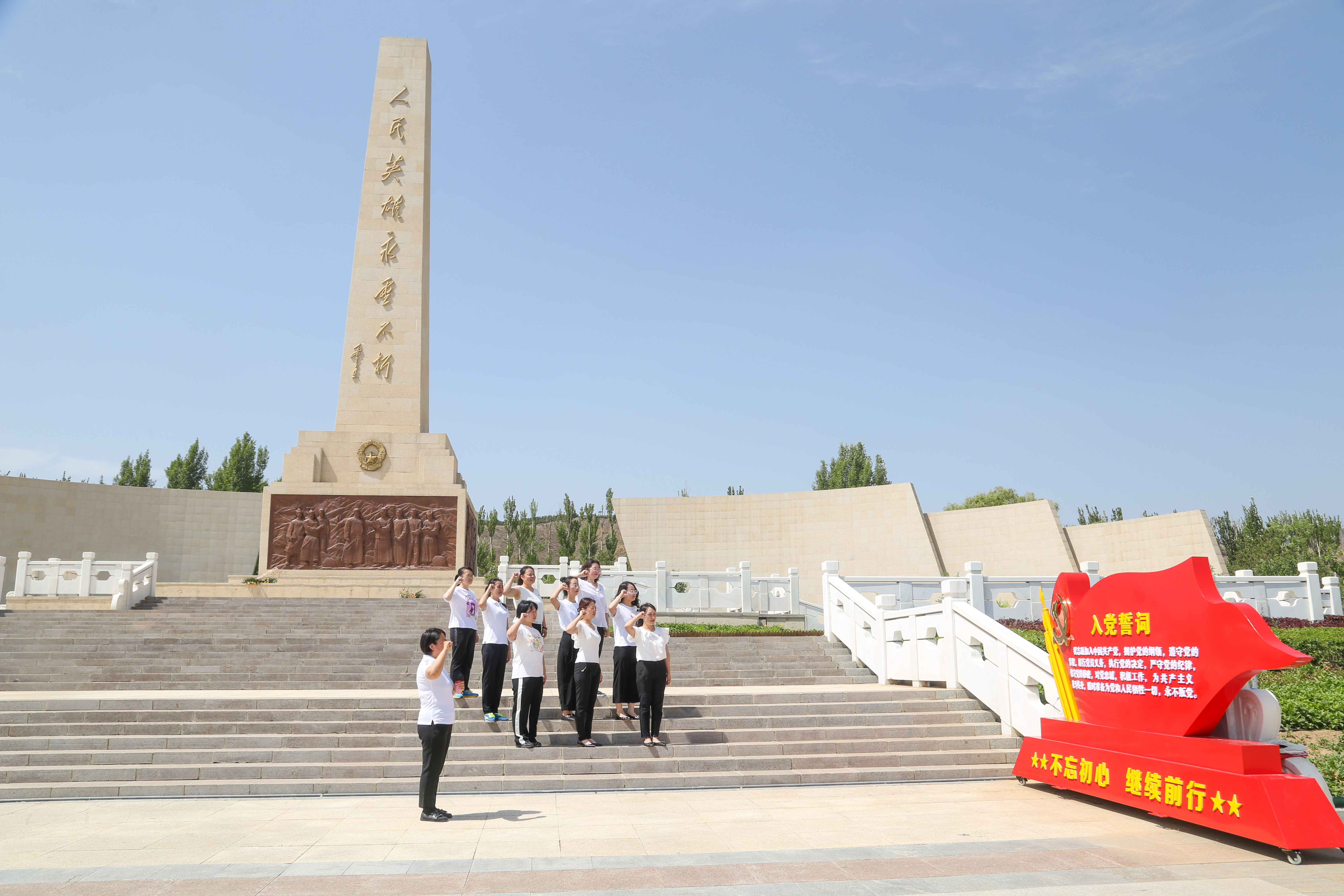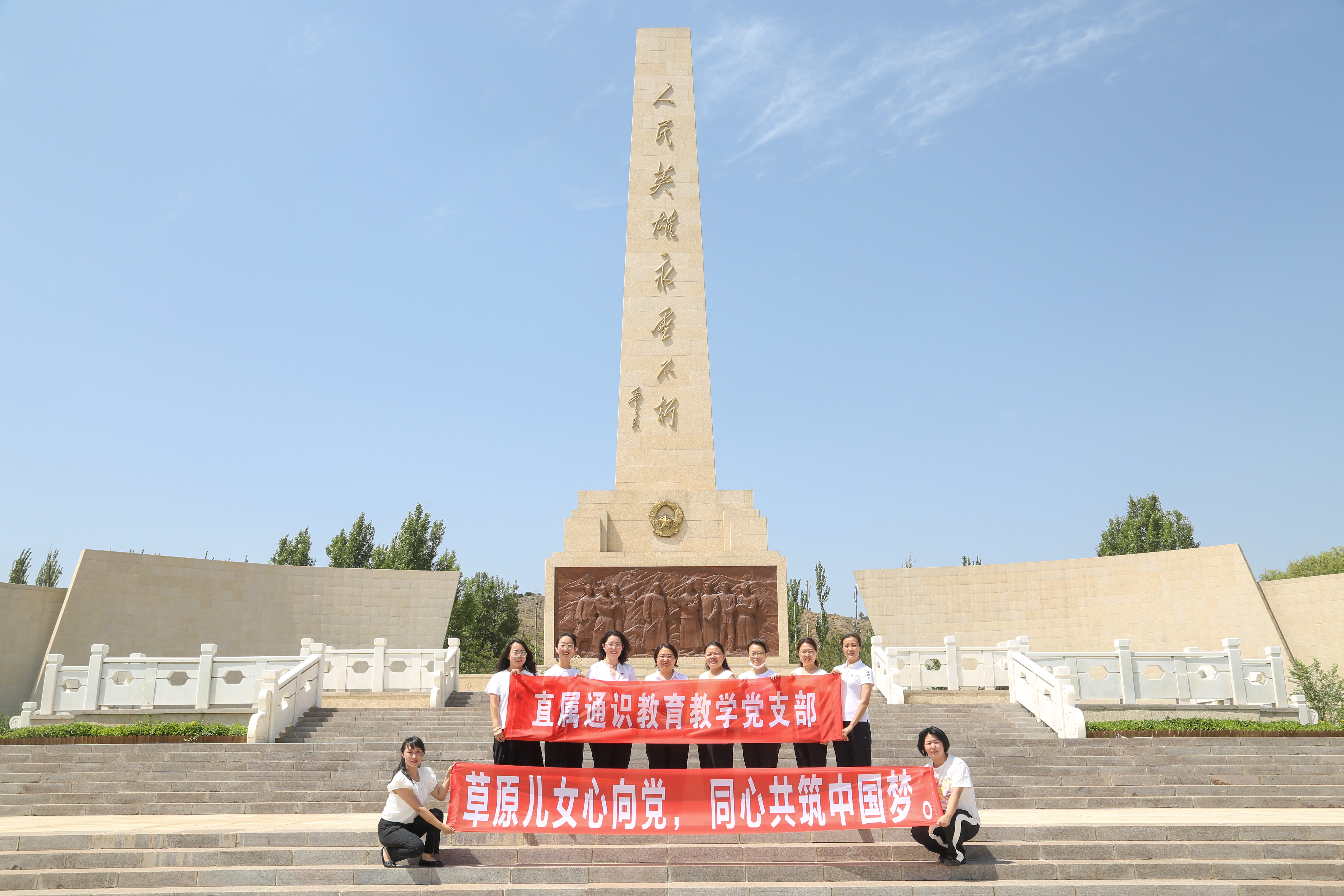 7月7日,直属通识教育教学党支部举行“庆七一、喜迎二十大“七个一”系列活动之“草原儿女心向党、同心共筑中国梦”主题党日活动。这一天,正值七七事变八十五周年纪念日,党员教师相聚在红色文化公园,怀着崇敬的⼼情来到⾰命烈⼠纪念碑前,缅怀先烈,重温⼊党誓词,回顾革命历史,坚定理想信念。