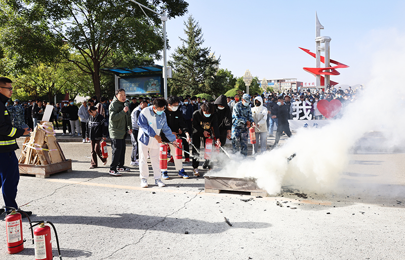 消防应急演练过程中,消防战士首先向大家讲解了灭火器的使用方法以及学校火灾防范重点等消防安全知识,然后指导师生使用灭火器进行灭火实战演练。