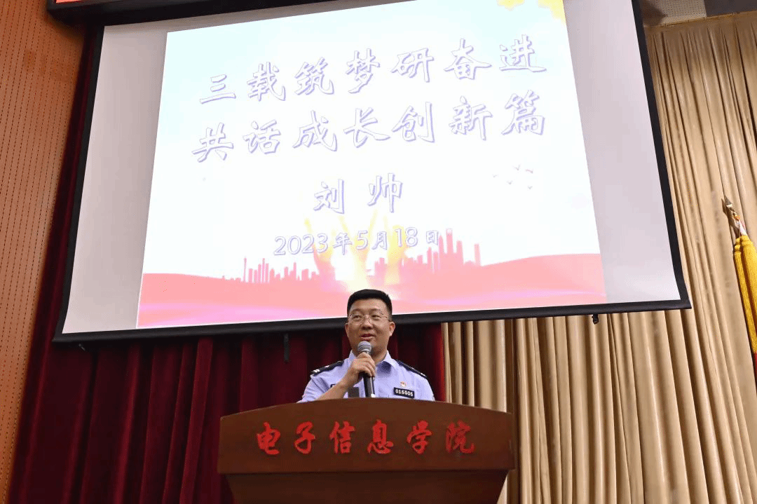 刘帅现任呼和浩特市公安局生态环境食品药品犯罪侦查支队勘查检验技术大队大队长,他以“三载筑梦研奋进 共话成长创新篇”为题,从大学生在校期间不同阶段学习任务的重点、学校与社会衔接时角色如何转变、对学弟学妹们真诚的建议等三个方面为在场的同学们生动的讲述了他成长的心路历程。