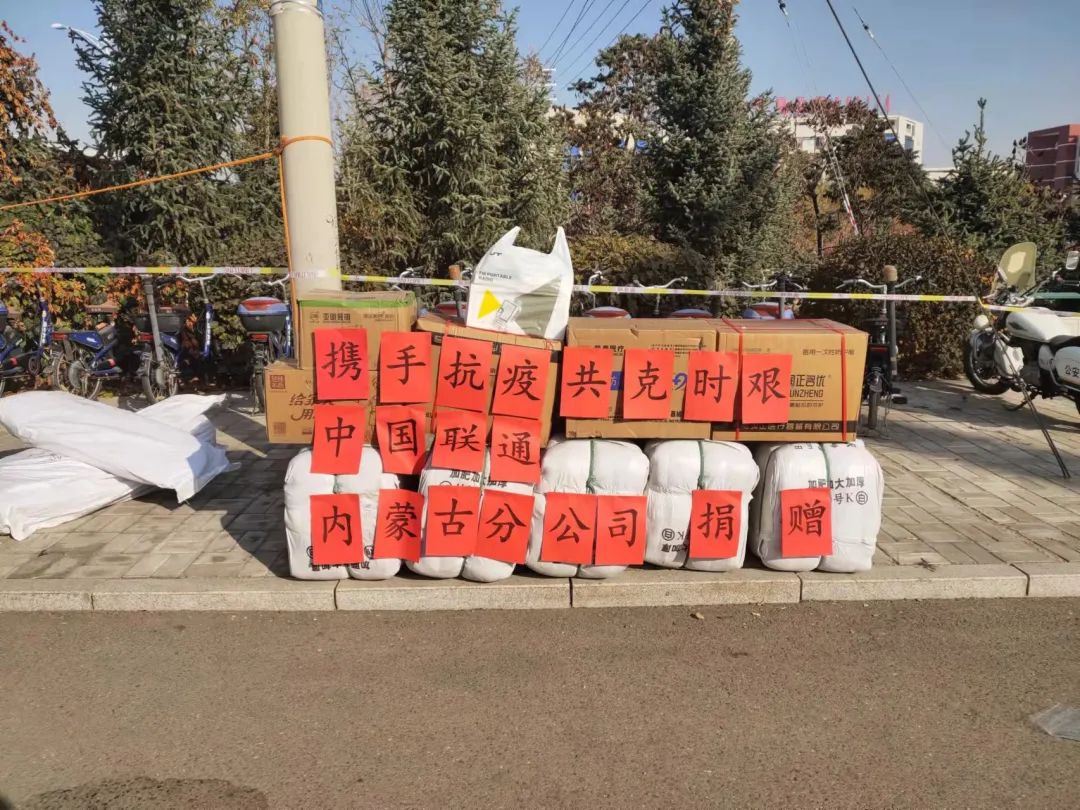 其中,中国联通内蒙古分公司捐赠防护服100套、N95口罩1000个、棉大衣50件、手电筒50个、对讲机10部、充电宝5个,中国银行呼和浩特市亿峰岛支行捐赠酒精消毒液500桶、餐盒4200个。创致云(内蒙古)人工智能科技有限公司捐赠方便面60箱、榨菜2箱、老干妈2箱、喷壶40个。北京华宇星航国际教育科技有限公司捐赠防护服200套、N95口罩3000个,内蒙古超星信息技术有限公司捐赠N95口罩1000只、防护套装30套、电动三轮车一辆。