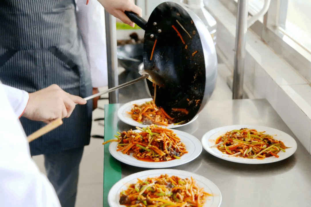 理论授课结束后,同学们穿上工衣工帽,围上围裙,认真准备食材、切菜、烹饪,一派热火朝天的忙碌景象。同学们热情高涨,积极参与,不一会儿,鱼香肉丝美食就新鲜出炉了。