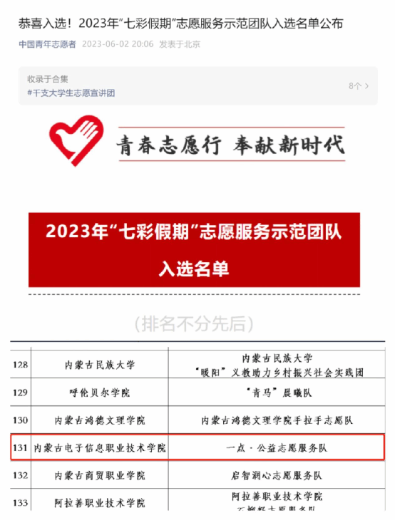 近日,团中央青年志愿者行动指导中心、中国青年志愿者协会秘书处发布了《关于遴选2023年“七彩假期”志愿服务示范团队的公告》。活动得到了全国高校青年志愿者团队的广泛关注和积极参与,经过层层筛选与审核,我校计算机与网络安全学院“一点·公益”志愿服务队从全国3762支志愿服务团队脱颖而出,入选为2023年“七彩假期”志愿服务示范团队。
