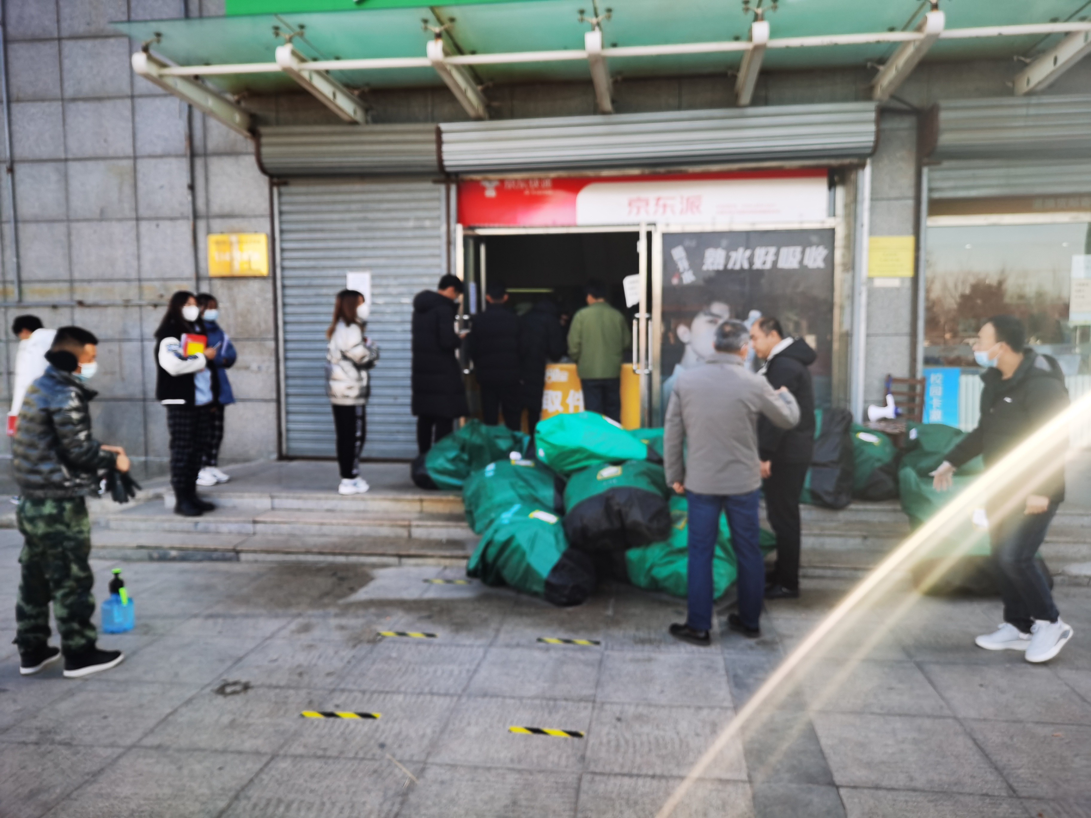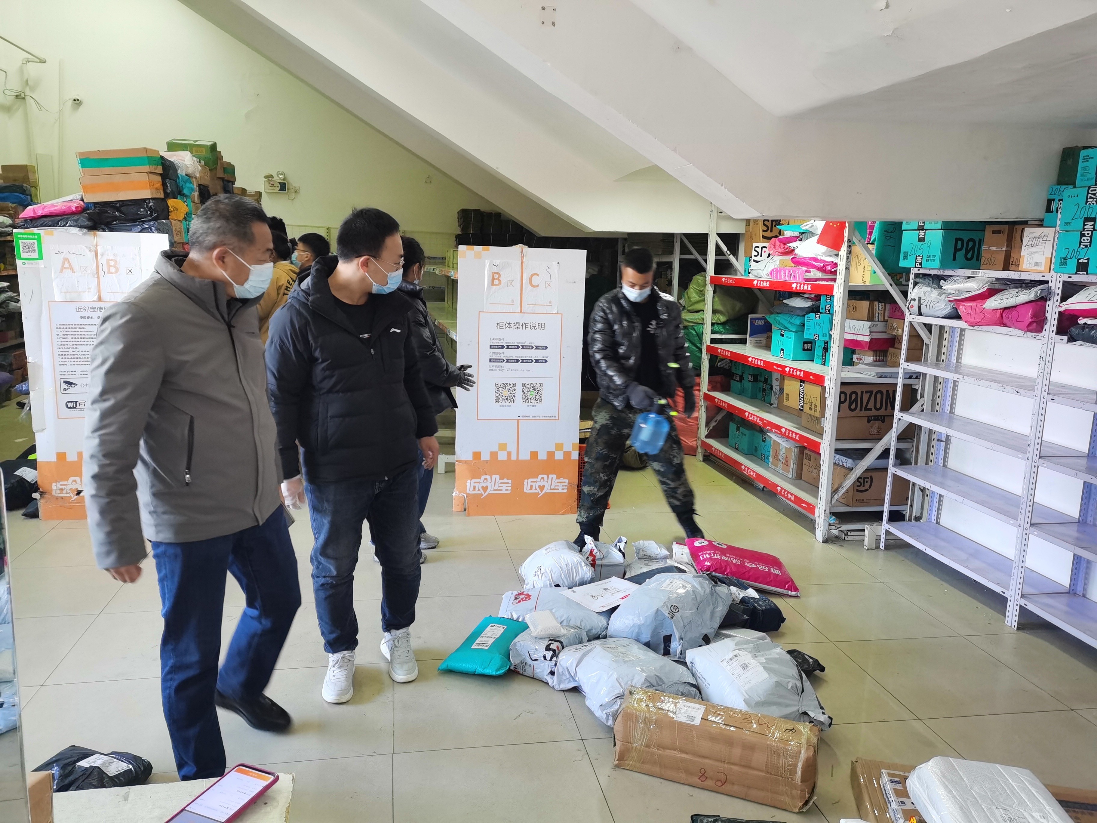11月16日,后勤管理处处长宋国松、副处长周俭带领后勤处相关人员对校园快递站近邻宝公司的防疫情况进行检查。