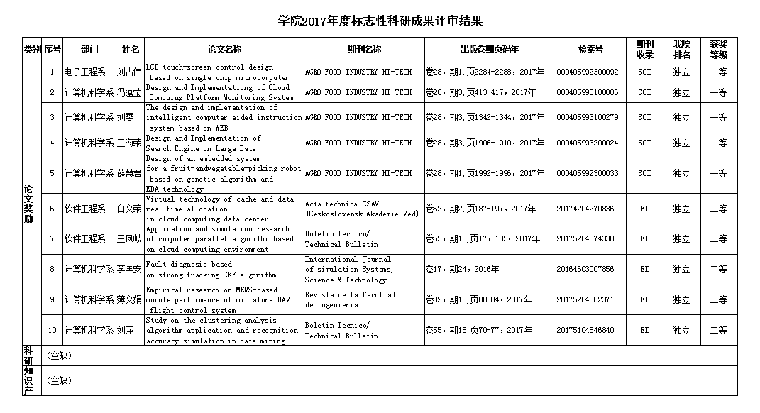 近日,学院2017年度标志性科研成果奖励揭晓。按照《内蒙古电子信息职业技术学院标志性成果奖励办法(试行)》(内电信院发〔2016〕25号)精神,经个人申报、学术委员会评审、校内公示、院长办公会议审定等环节,最终,共有十篇论文荣获学院2017年标志性科研成果奖励,其中,电子工程系刘占伟副教授等5名教师的论文分获一等奖,软件工程系白文荣副教授等5名教师的论文分获二等奖。